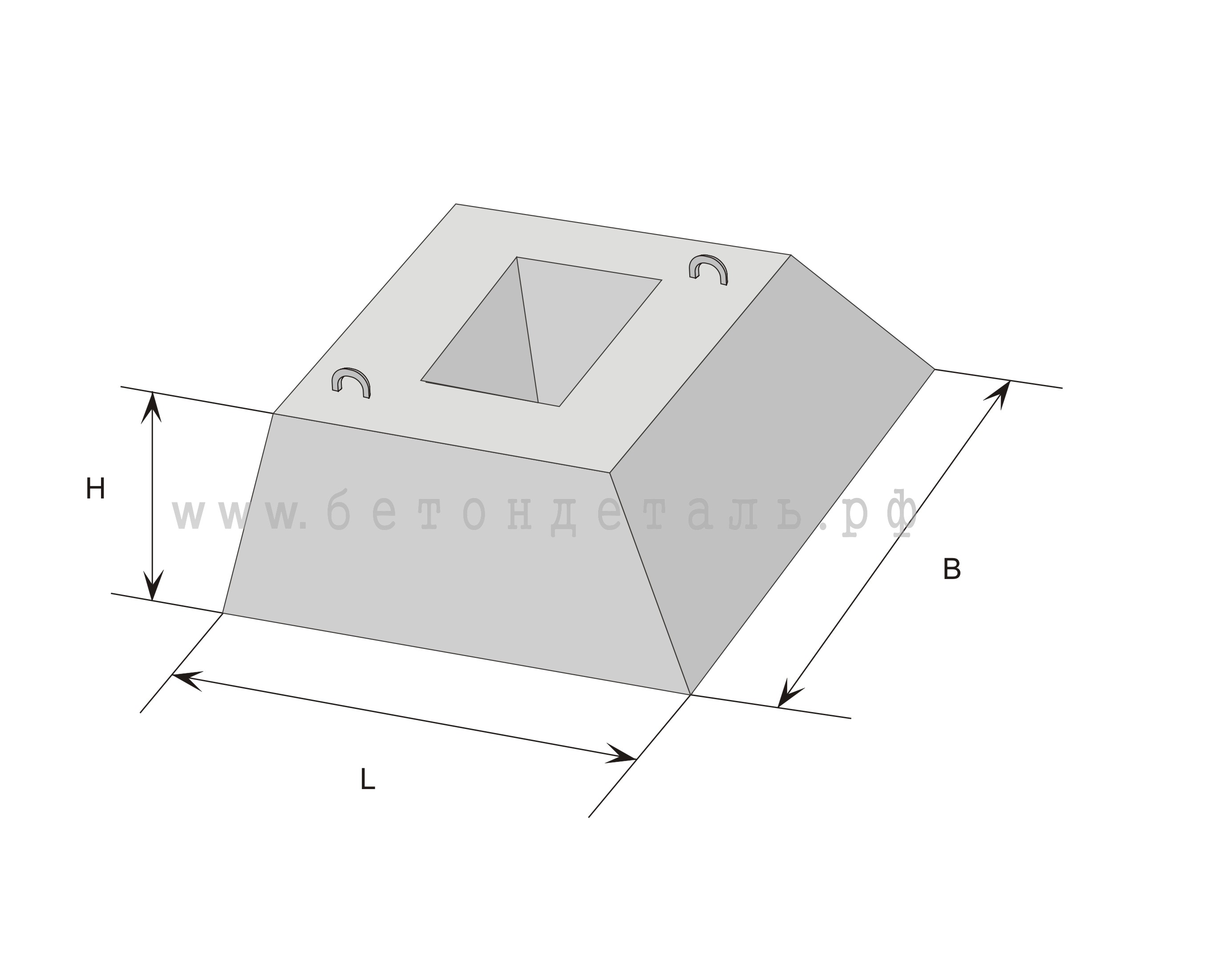 Сборный фундамент имеет высоту 900 мм, при этом, глубина стакана - 650 мм. Значительная глубина позволяет надежно зафиксировать плиты в стакане. Прочный бетон фундамента (класса В15) не позволяет конструкции разрушаться на протяжении достаточно долгого времени.