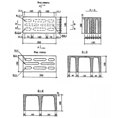 Камни для кладки стен КСР-ПР-ПС 39. Унифицированные изделия, имеющие прямоугольную форму с рядом конструктивных особенностей в виде выступов, углублений и отверстий.